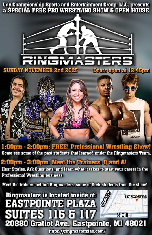 - Ringmasters Pro Wrestling School Now Open!As of November 2, 2025, the doors are now open to Ringmasters Pro Wrestling School! We kicked off the new era of Detroit professional wrestling… Read more: Ringmasters Pro Wrestling School Now Open!